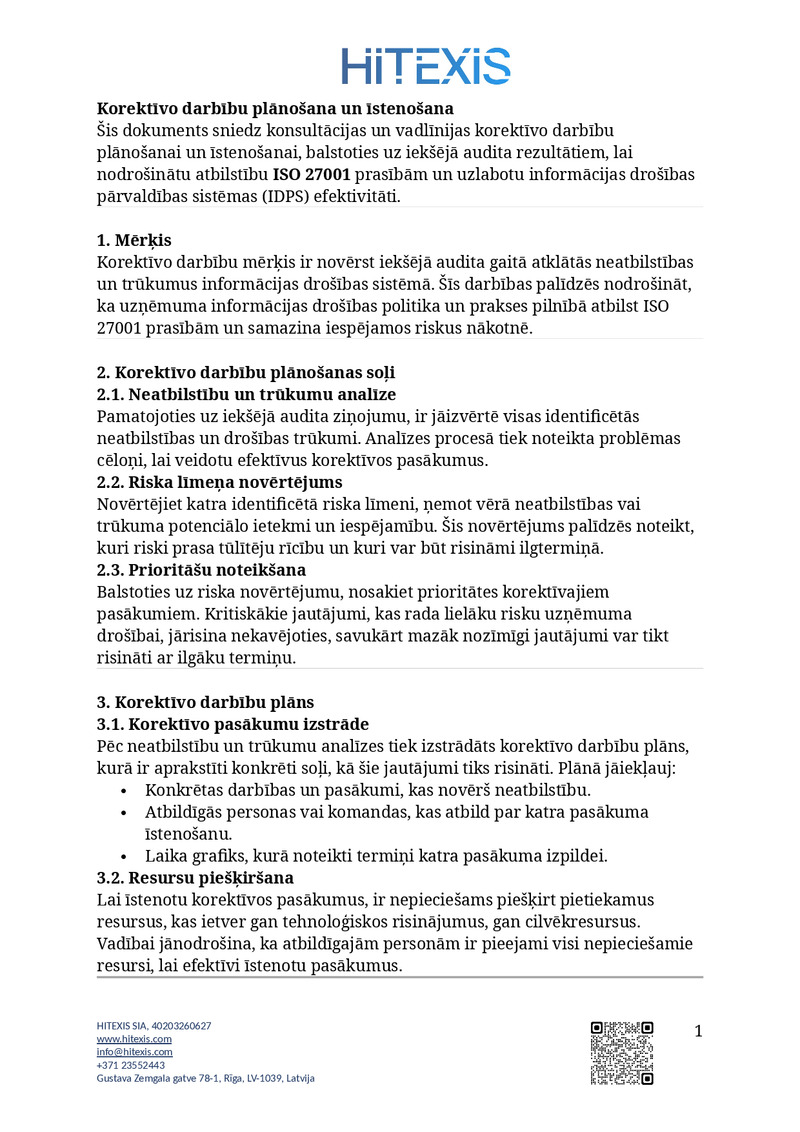 Šis dokuments sniedz konsultācijas un vadlīnijas korektīvo darbību plānošanai un īstenošanai, balstoties uz iekšējā audita rezultātiem, lai nodrošinātu atbilstību ISO 27001 prasībām un uzlabotu informācijas drošības pārvaldības sistēmas (IDPS) efektivitāti.