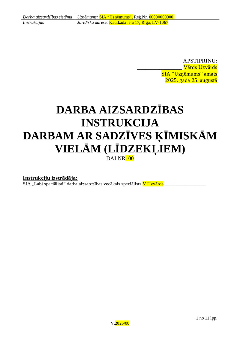 Darba aizsardzības instrukcija paredzēta izmantošanai, iekļaujot to esošajā vai jaunajā darba aizsardzības sistēmā. Instrukcijā iekļauta informācija par sadzīvē izmantojamām ķīmiskām vielām, tādām kā dezinfekcijas līdzekļi, automašīnas kopšanas līdzekļi, degviela, mazgāšanas līdzekļi u.c. Instrukcijā ir aprakstītas darbības uzsākot, veicot un beidzot darbu ar ķīmiskām vielām, kā arī rīcība ārkārtas situācijās.