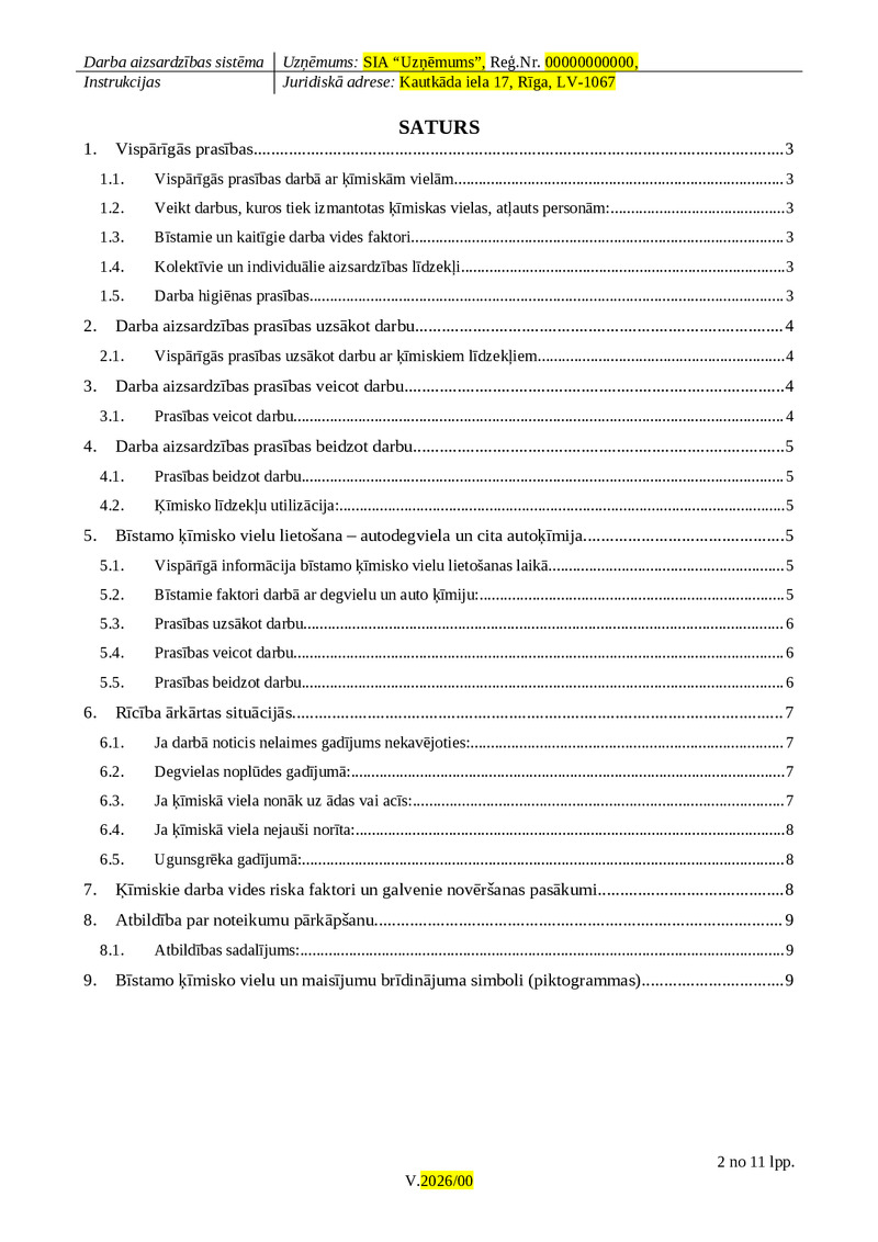 | Nosaukums | Darba aizsardzības instrukcija darba ar sadzīves ķīmiskām vielām (līdzekļiem) noņemt | Darba vides risku novērtējums biroja darbam noņemt | Darba aizsardzības instrukcija ievadapmācība noņemt | Darba aizsardzības instrukcija neelktrotehniskajam personālam elektrodrošībā noņemt | Darba aizsardzības instrukcija vadot automobili noņemt | Darba aizsardzības instrukcija darbam ar būvķīmiju noņemt |