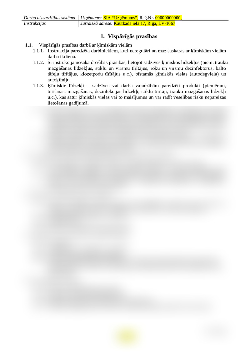 | Apraksts | Darba aizsardzības instrukcija paredzēta izmantošanai, iekļaujot to esošajā vai jaunajā darba aizsardzības sistēmā. Instrukcijā iekļauta informācija par sadzīvē izmantojamām ķīmiskām vielām, tādām kā dezinfekcijas līdzekļi, automašīnas kopšanas līdzekļi, degviela, mazgāšanas līdzekļi u.c. Instrukcijā ir aprakstītas darbības uzsākot, veicot un beidzot darbu ar ķīmiskām vielām, kā arī rīcība ārkārtas situācijās. | Darba vides risku novērtējums (DVRN) nodarbinātajiem, kuri veic dažāda veida biroja darbus. DVRN ietver visus darba vides riska faktorus gan tos, kas pastāv, gan tos, kuri nepastāv veicot biroja darbus, tādejādi risku novērtējums ir pilnīgs un atbilst normatīvajiem aktiem. | Darba aizsardzības instrukcija paredzēta izmantošanai, iekļaujot to esošajā vai jaunajā darba aizsardzības sistēmā. Instrukcijā iekļauta visu normatīvajos aktos nepieciešamā informācija, kas nepieciešama ievadapmācībai. Instrukcijā ir atzīmētas vietas, kuras nepieciešams pielāgot konkrētajam uzņēmumam. | Darba aizsardzības instrukcija paredzēta izmantošanai, iekļaujot to esošajā vai jaunajā darba aizsardzības sistēmā. Instrukcijā iekļauta visa informācija, kura nepieciešama neeeltrotehniskajam personālam elektrodrošībā, lai ievēroti minimālās prasības saskaņā ar normatīvajiem aktiem. | Darba aizsardzības instrukcija paredzēta izmantošanai, iekļaujot to esošajā vai jaunajā darba aizsardzības sistēmā. Instrukcijā iekļauti visi automobiļu dzinēju tipi (iekšdedzes dzinēji, elektro, H2). Instrukcijas saturs attiecas uz nodarbinātajiem, kuru darba pienākumos ietilpst autotransporta vadīšana. | Darba aizsardzības instrukcija paredzēta izmantošanai, iekļaujot to esošajā vai jaunajā darba aizsardzības sistēmā. Instrukcijā iekļauta informācija par izmantojamo būvķimiju būvlaukuma sagatavošanas darbos, demontāžas, koka impregnēšanas, betonēšanas, apdares, siltināšanas, hidrosizolācijas, AVK, UAS, UK, EL u.c. darbos, kā arī ceļu un tiltu būvniecībā |