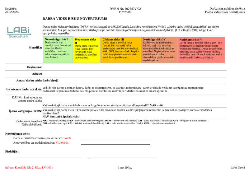 Darba vides risku novērtējums (DVRN) nodarbinātajiem, kuri veic dažāda veida biroja darbus. DVRN ietver visus darba vides riska faktorus gan tos, kas pastāv, gan tos, kuri nepastāv veicot biroja darbus, tādejādi risku novērtējums ir pilnīgs un atbilst normatīvajiem aktiem.