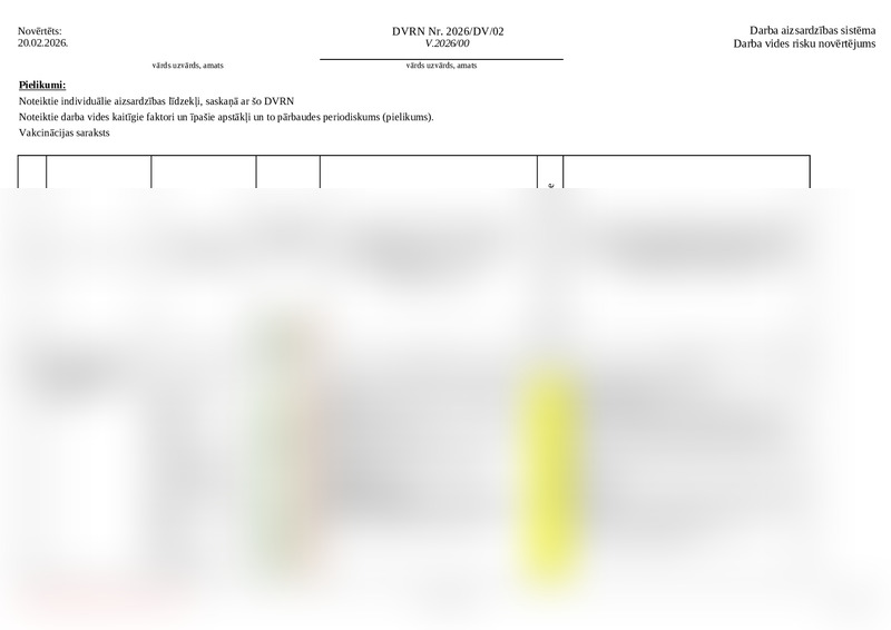 | Nosaukums | Darba vides risku novērtējums biroja darbam noņemt | Darba aizsardzības instrukcija ievadapmācība noņemt | Darba aizsardzības instrukcija neelktrotehniskajam personālam elektrodrošībā noņemt | Darba aizsardzības instrukcija darba ar sadzīves ķīmiskām vielām (līdzekļiem) noņemt | Darba aizsardzības instrukcija, veicot biroja darbu noņemt | Darba aizsardzības instrukcija pirmās palīdzības sniegšanā noņemt |
