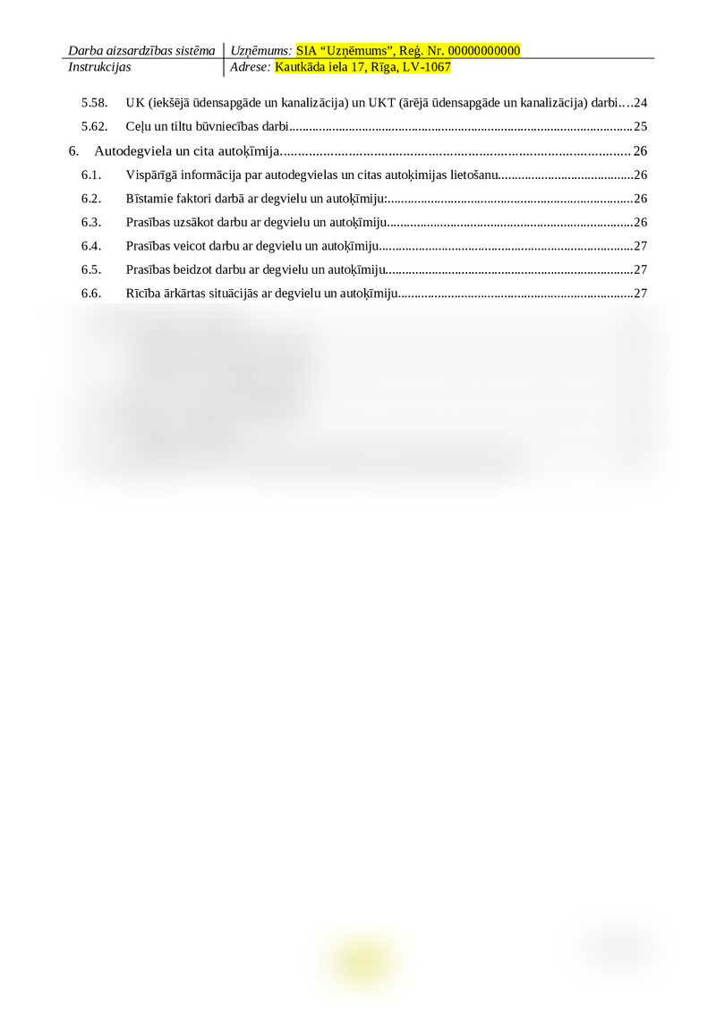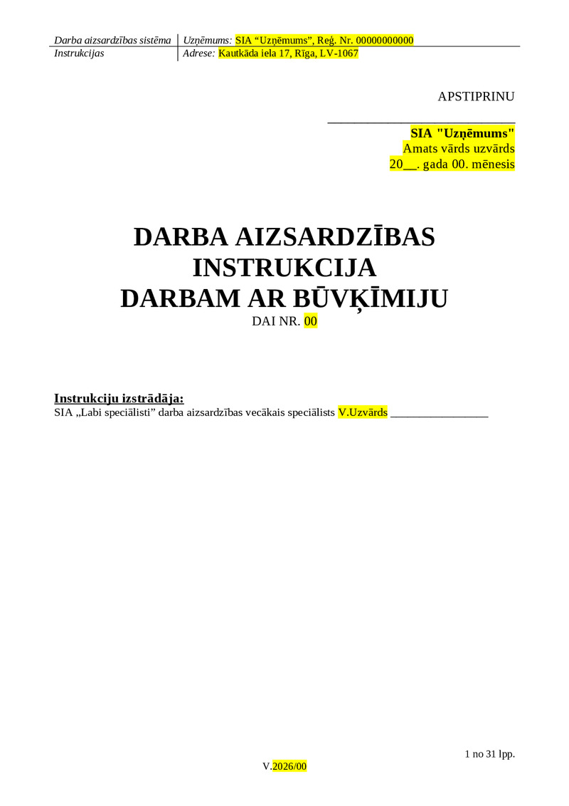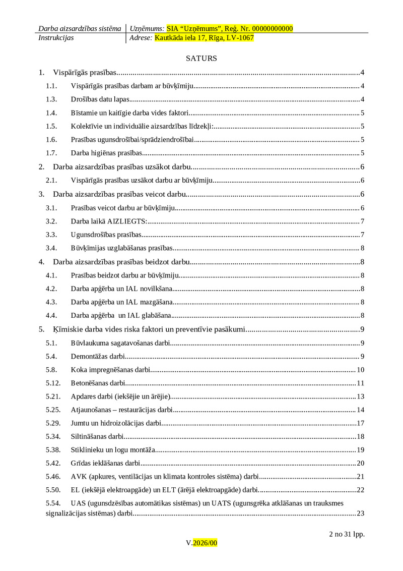 | Description | Darba aizsardzības instrukcija paredzēta izmantošanai, iekļaujot to esošajā vai jaunajā darba aizsardzības sistēmā. Instrukcijā iekļauta informācija par izmantojamo būvķimiju būvlaukuma sagatavošanas darbos, demontāžas, koka impregnēšanas, betonēšanas, apdares, siltināšanas, hidrosizolācijas, AVK, UAS, UK, EL u.c. darbos, kā arī ceļu un tiltu būvniecībā | Darba aizsardzības instrukcija paredzēta izmantošanai, iekļaujot to esošajā vai jaunajā darba aizsardzības sistēmā. Instrukcijā iekļauta visa informācija, kura nepieciešama neeeltrotehniskajam personālam elektrodrošībā, lai ievēroti minimālās prasības saskaņā ar normatīvajiem aktiem. | Darba aizsardzības instrukcija paredzēta izmantošanai, iekļaujot to esošajā vai jaunajā darba aizsardzības sistēmā. Instrukcijā iekļauta informācija par galvenajiem pirmās palīdzības sniegšanas paņēmieniem dažādās situācijās, kuri atbilst normatīvajiem aktiem. | Darba vides risku novērtējums (DVRN) nodarbinātajiem, kuri veic dažāda veida biroja darbus. DVRN ietver visus darba vides riska faktorus gan tos, kas pastāv, gan tos, kuri nepastāv veicot biroja darbus, tādejādi risku novērtējums ir pilnīgs un atbilst normatīvajiem aktiem. | Darba aizsardzības instrukcija paredzēta izmantošanai, iekļaujot to esošajā vai jaunajā darba aizsardzības sistēmā. Instrukcijā iekļauta informācija par sadzīvē izmantojamām ķīmiskām vielām, tādām kā dezinfekcijas līdzekļi, automašīnas kopšanas līdzekļi, degviela, mazgāšanas līdzekļi u.c. Instrukcijā ir aprakstītas darbības uzsākot, veicot un beidzot darbu ar ķīmiskām vielām, kā arī rīcība ārkārtas situācijās. | Darba aizsardzības instrukcija paredzēta izmantošanai, iekļaujot to esošajā vai jaunajā darba aizsardzības sistēmā. Instrukcijā iekļauta visu normatīvajos aktos nepieciešamā informācija, kas nepieciešama ievadapmācībai. Instrukcijā ir atzīmētas vietas, kuras nepieciešams pielāgot konkrētajam uzņēmumam. |